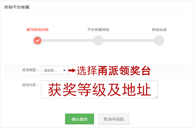 C、按規則選擇甬派領獎臺填寫獲獎等級及收貨地址。