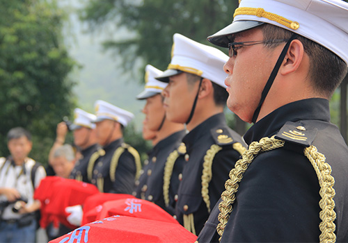 圖為儀仗隊手捧9位老兵的骨灰盒
