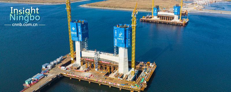 近日,在寧波市北侖區(qū),寧波舟山港六橫公路大橋一期項目施工現(xiàn)場熱火朝天,梅山水道橋下塔柱、下橫梁已澆筑完成,兩座索塔在海上拔地而起,梅山互通主線橋橋面鋪裝施工也全面展開,海上巨龍初現(xiàn)雛形。鄭凱俠 攝
